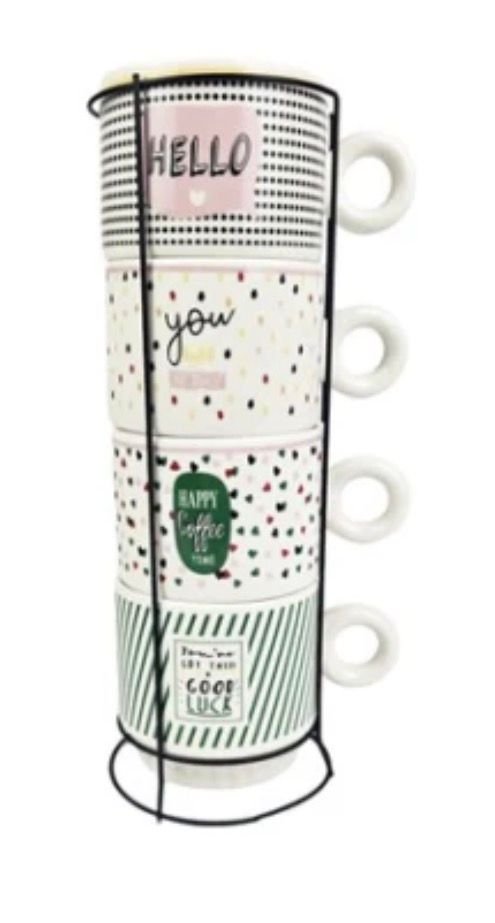 Elegante set de 4 tazas con soporte metálico, ideal para disfrutar café, té o infusiones. Su diseño moderno con frases y detalles decorativos aporta un toque especial a la cocina o mesa.